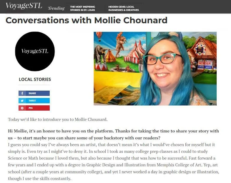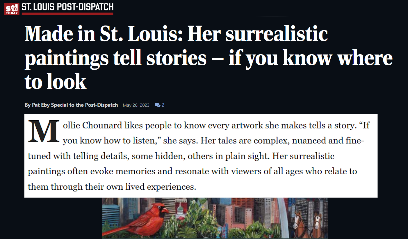 I’m a modern fantasy and surreal painter from St. Louis, MO. I toe the line somewhere between illustration and fine art, and I credit my art school experience with showing me that Graphic Design wasn’t for me. Rather I fell in love with painting, and have been working in acrylics for more years than I care to say (no sense telling you how old I am - wink). I travel around the country doing art fairs, exhibitions, and the occasional workshop.